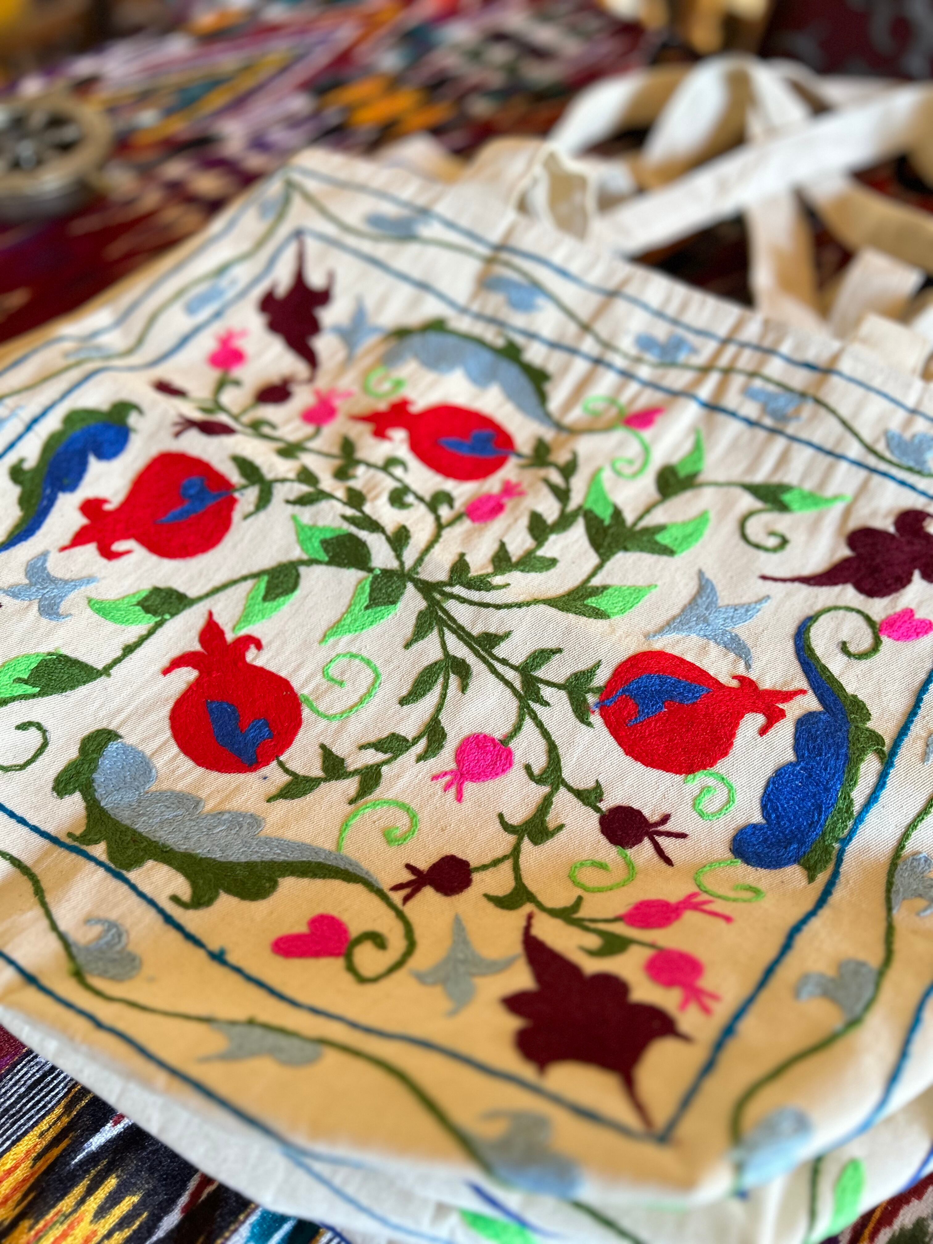 スザニは「針」を意味するペルシャ語が語源で、主に布団の覆いや壁飾り、敷布として使われ、地域によってザクロ、植物、鳥などのモチーフが異なり、一つ一つ手作りで作られる温かみのある手仕事の芸術品です。