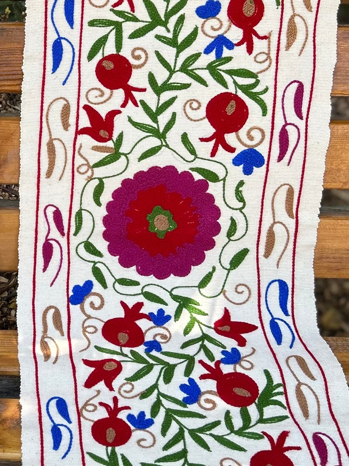 スザニは「針」を意味するペルシャ語が語源で、主に布団の覆いや壁飾り、敷布として使われ、地域によってザクロ、植物、鳥などのモチーフが異なり、一つ一つ手作りで作られる温かみのある手仕事の芸術品です。