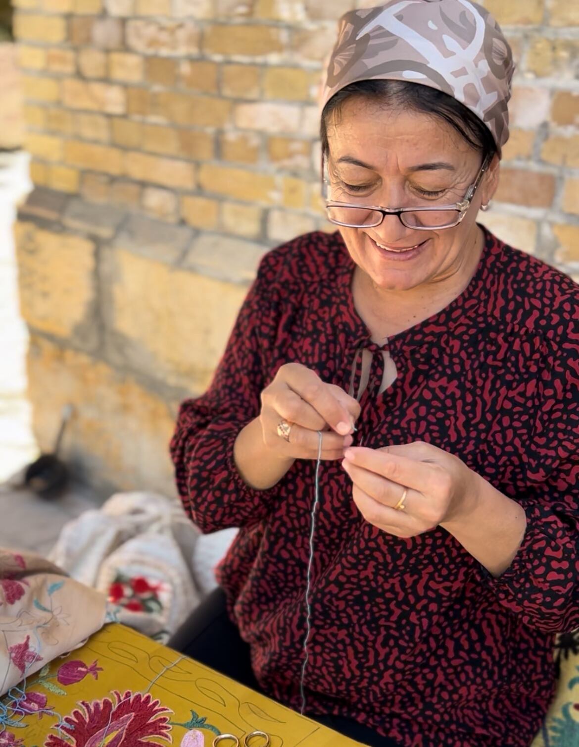 針で施された中央アジアの伝統的な刺繍布で、結婚式の嫁入り道具として新婦が持参したり、家宝として代々受け継がれたりしてきました。