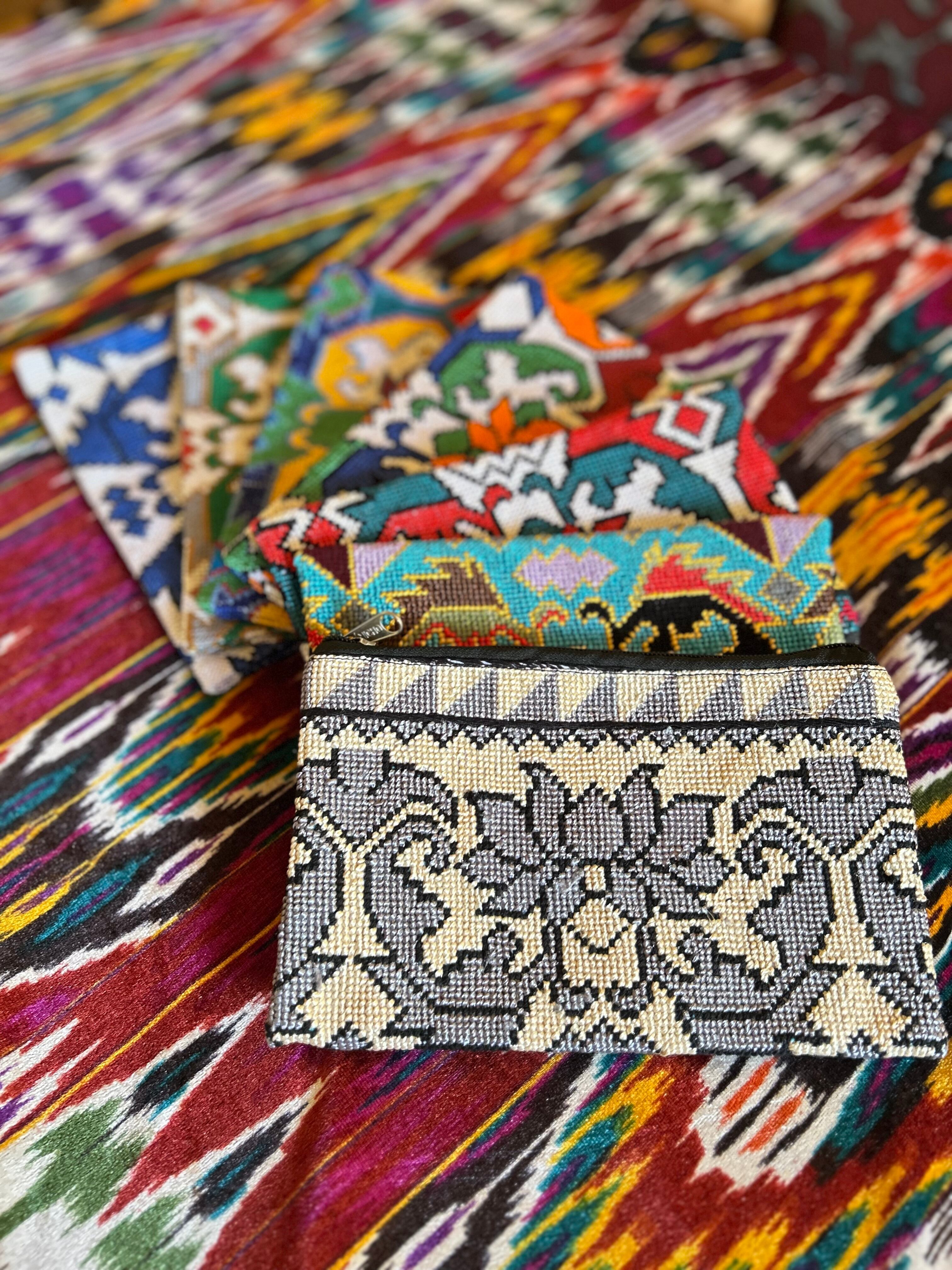 ☆ウズベキスタン 刺繍ポーチ  細かい刺繍が施された美しいポーチです!  【ウズベキスタンの刺繍】 ウズベキスタンの伝統的な刺繍技術を活かし、一つ一つ丁寧に手作りされています。刺繍は、この地域特有の色彩豊かなパターンやモチーフを取り入れており、生活空間に彩りを添えるアイテムとしても大変魅力的です。ポーチは小物入れとしてはもちろん、贈り物や収納にも最適です。華やかなデザインが、日常の中で特別な瞬間を演出してくれることでしょう。